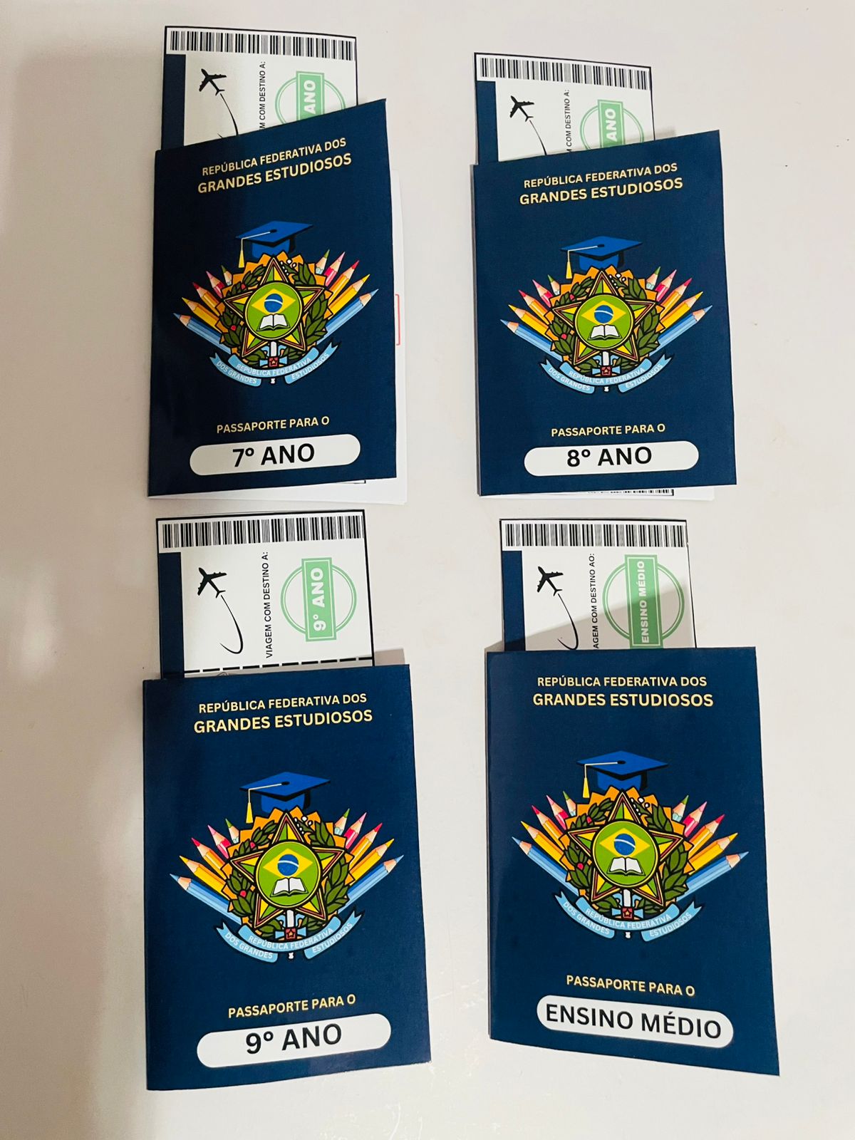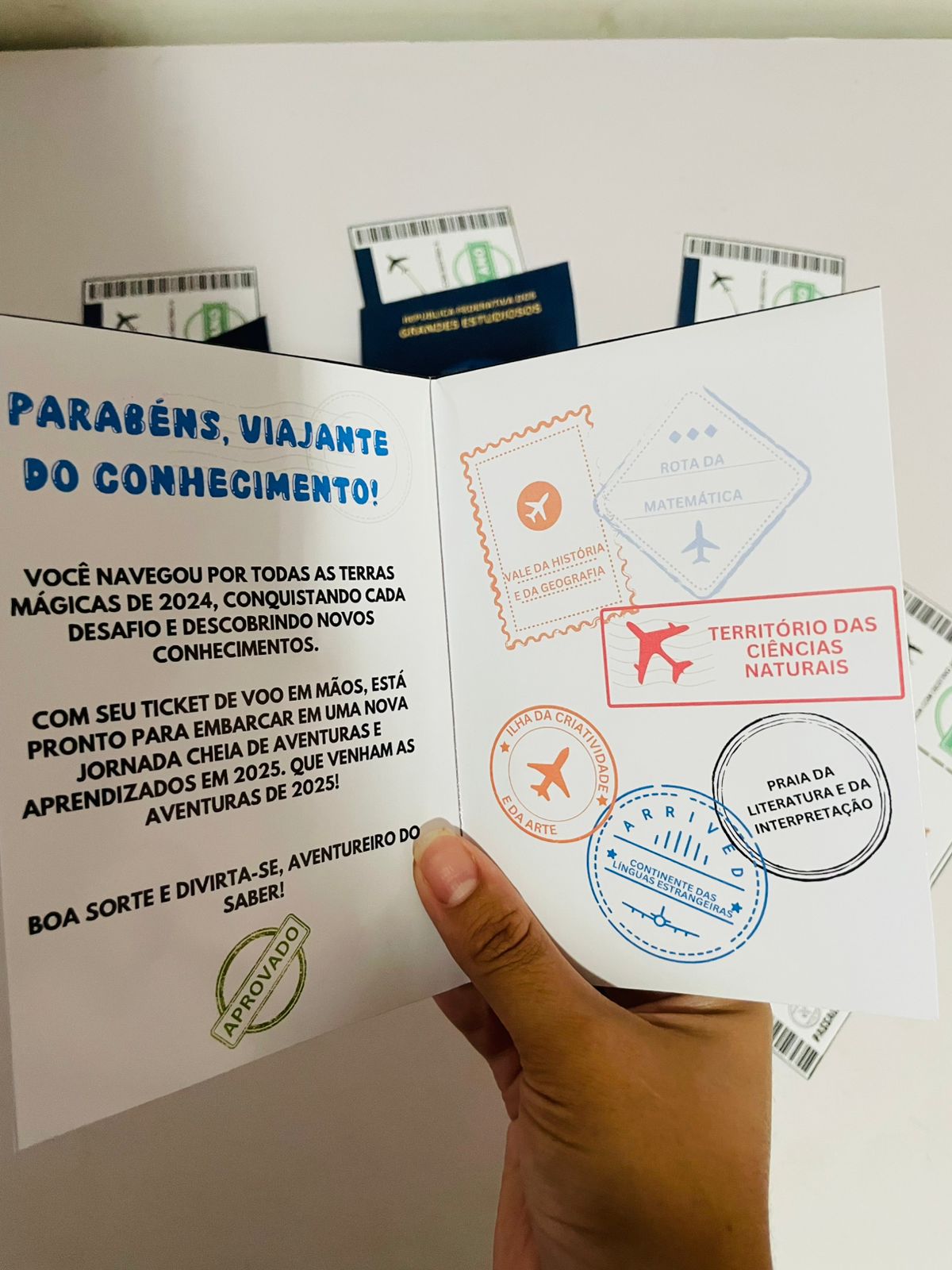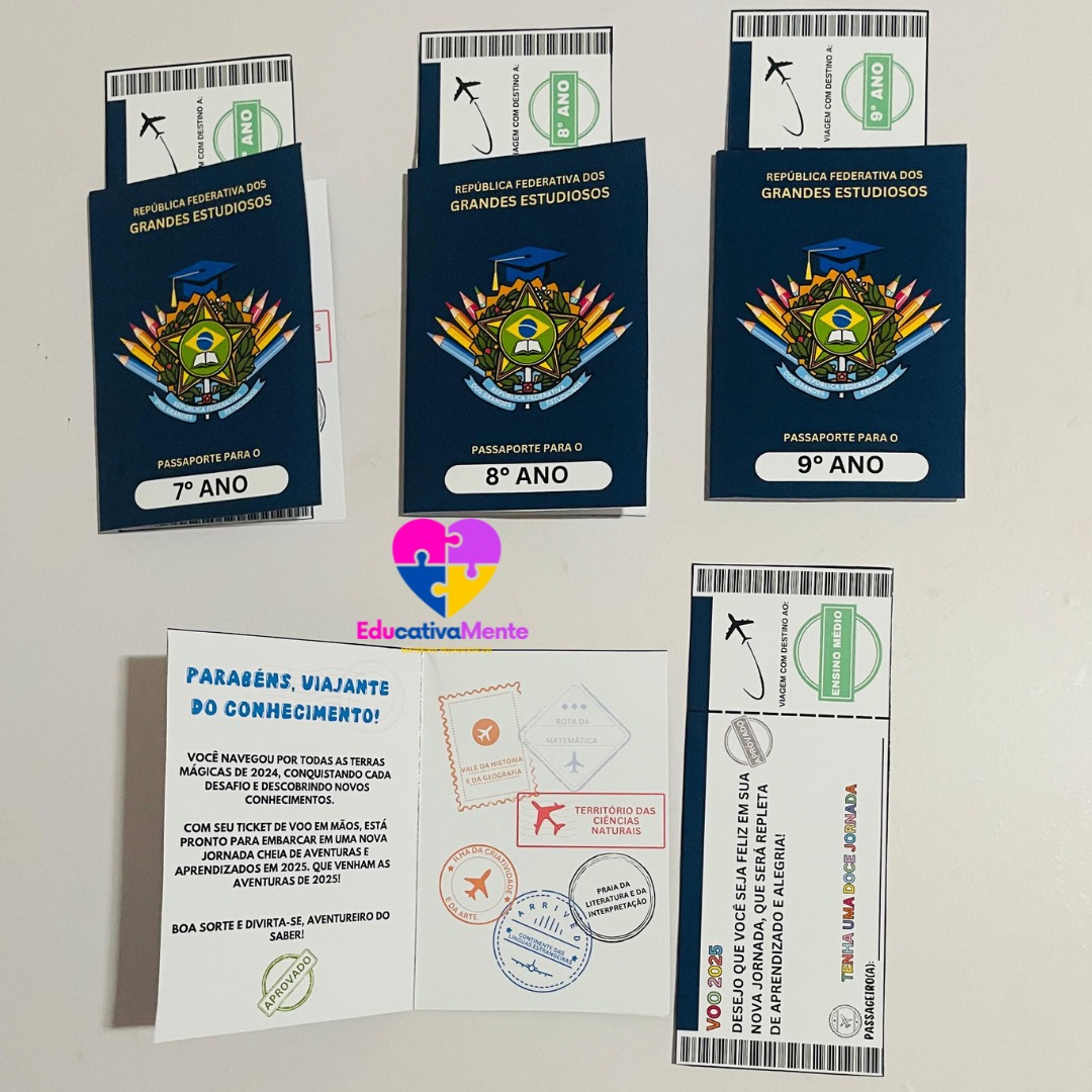 📖 Passaporte do 7° ano ao Ensino Médio – Com uma mensagem motivadora que reconhece as aventuras de 2024 e prepara os alunos para as descobertas de 2025. Inclui carimbos que representam conquistas importantes na jornada escolar, destacando as etapas do aprendizado e crescimento ao longo do ano.