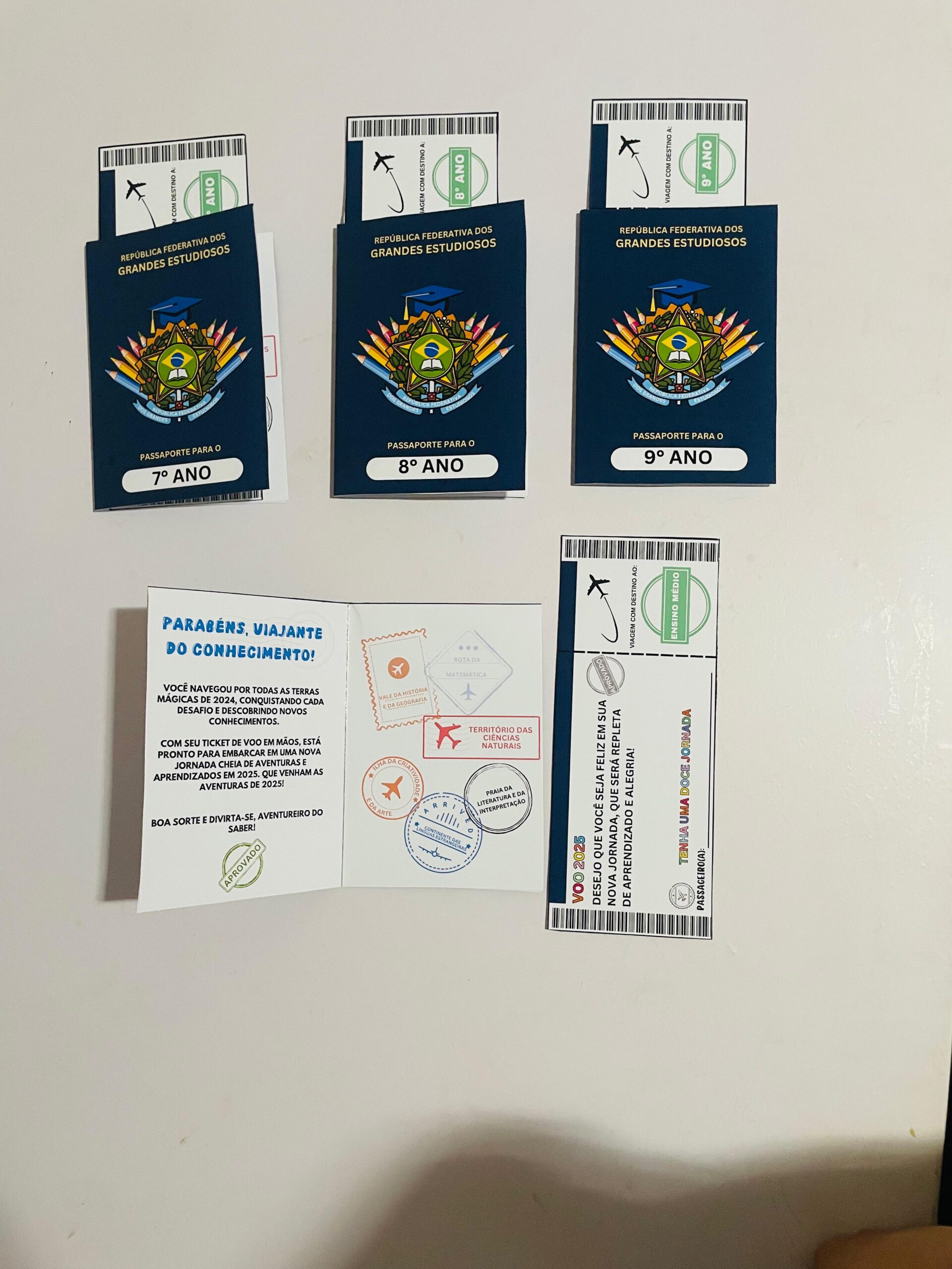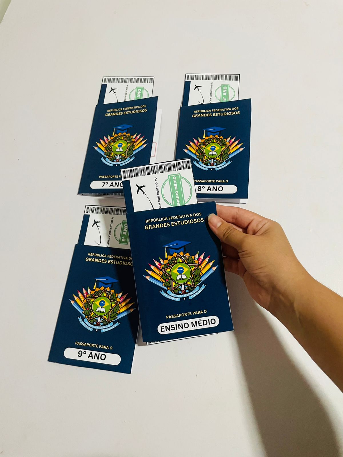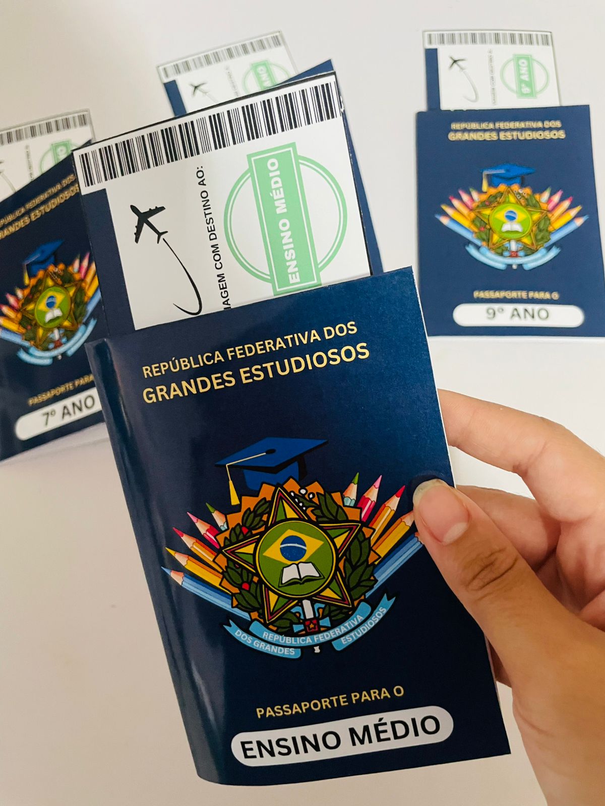 📖 Passaporte do 7° ano ao Ensino Médio – Com uma mensagem motivadora que reconhece as aventuras de 2024 e prepara os alunos para as descobertas de 2025. Inclui carimbos que representam conquistas importantes na jornada escolar, destacando as etapas do aprendizado e crescimento ao longo do ano.